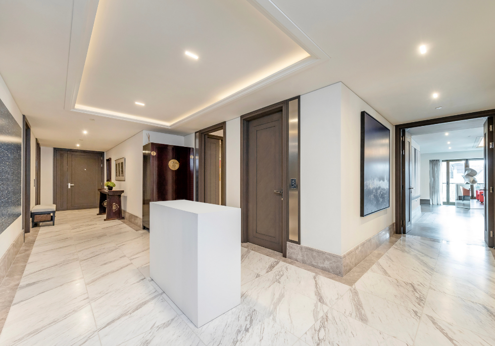 Glass doors from the sweeping driveway open onto the Art Deco inspired reception, with 24 hour concierge and sculpture by Yasemen Hussein, and the grand hall, a 60 foot high atrium which rises from the lower ground floor to the top of the building. The atrium is surmounted by ‘Amaranthyne’, a spectacular dome lighting sculpture shining down from the ceiling, reminiscent of the architecture of the historic aristocratic houses in Mayfair.