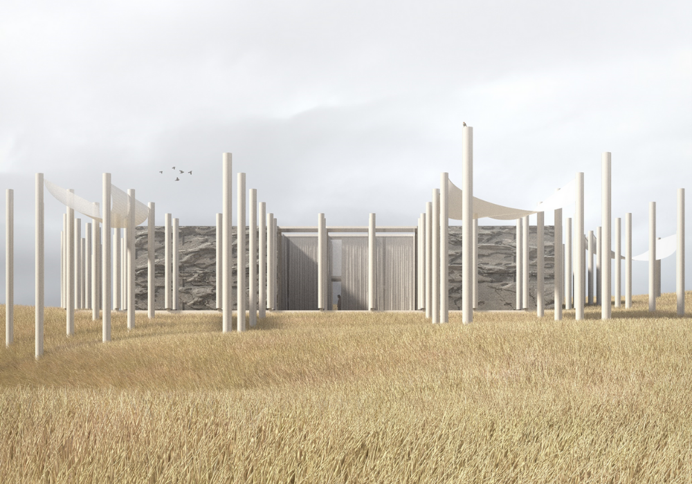 “Internally everything is organized from a central courtyard that divides the program while bringing natural light to all rooms. The courtyard, open to the ocean, focuses the entire house on the sea view and transforms the front façade into the social area, with pool, outdoor living, formal dining space and the option for a fireplace. The house is designed based on a modular principle that allows a response to different needs without losing the spatial quality and identity. The proposed grid focuses not only on the building, but also incorporates the landscape variations throughout the year. The addition of swaying textiles to the columns will add a soft and contrasting layer to create shadows that shift and dance with the sun’s position.”