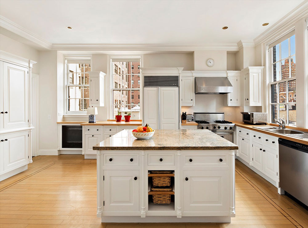 The grand hallway leads through to the 22 ft. library, which hosts a wood burning fireplace for cozy warmth and atmosphere. The magnificent living room, 27 x 17 ft., also offers a wood burning fireplace for relaxed entertaining. The elegant 20 ft. dining room leads off to a very light, airy and spacious chef's kitchen, 19 x 18 ft with a large corner banquette, granite and wood-block counter tops, custom designed cabinetry by Smallbone of Devizes of England, and in-built top-of-the-line Viking and Sub-Zero appliances.