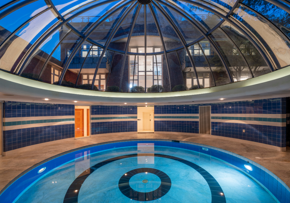 The curved poolside walls are lined with six-inch square glazed tiles divided by a double band of white tiles split by a row of lighter marine-blue tiles, with the pool house topped by a glass dome, 18 foot high at its apex.
