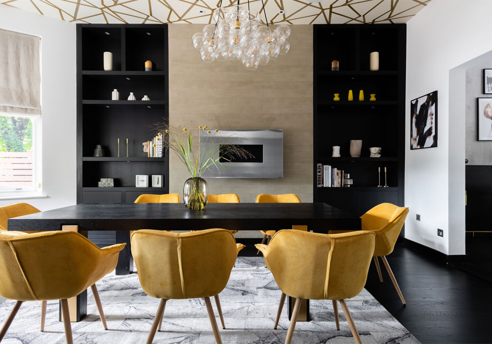 Heading up the stairs to the ground floor, there is an elegant dining room with a black and honey theme and bespoke shelving, high ceiling, feature chandelier and space for at least eight people. The drawing room next door is similarly colourful, with hardwood flooring, sash windows and a balcony.