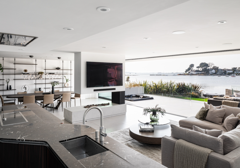 Recently recognised as the Best Residential Property in Dorset and the Best Residential Interior Private Residence in Dorset, Velaro comprises over 4000sq ft of luxury living accommodation and boasts extensive use of floor to ceiling glass on both front and rear elevations, allowing for natural light to flood the property at all times of the day and calming sea views from all principal rooms. The property is arranged over three floors and incorporates an extensive family room, a further reception room with a bar and games area, elaborate master suite plus three additional bedrooms with ensuites. On entering the property there is a sense of immediate grandeur and natural beauty as a result of a triple height hallway, which along with a bespoke contemporary oak staircase, features internal stepping stones inset within artificial turf, a feature olive tree, exposed stone walling and a cascade of designer pendants. The cutting-edge design is complemented by a range of luxury finishes including a designer Italian kitchen with both Gaggenau and Siemens appliances, Italian porcelain tiles to bathrooms and floors, multiple fitted media compositions with built-in bioethanol fireplaces and an abundance of bespoke designer furniture throughout the utility room and bedrooms.